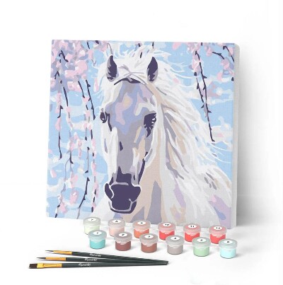 Modello: Dipingere con i Numeri 20x20cm con cornice Cavallo bianco e fiori rosa